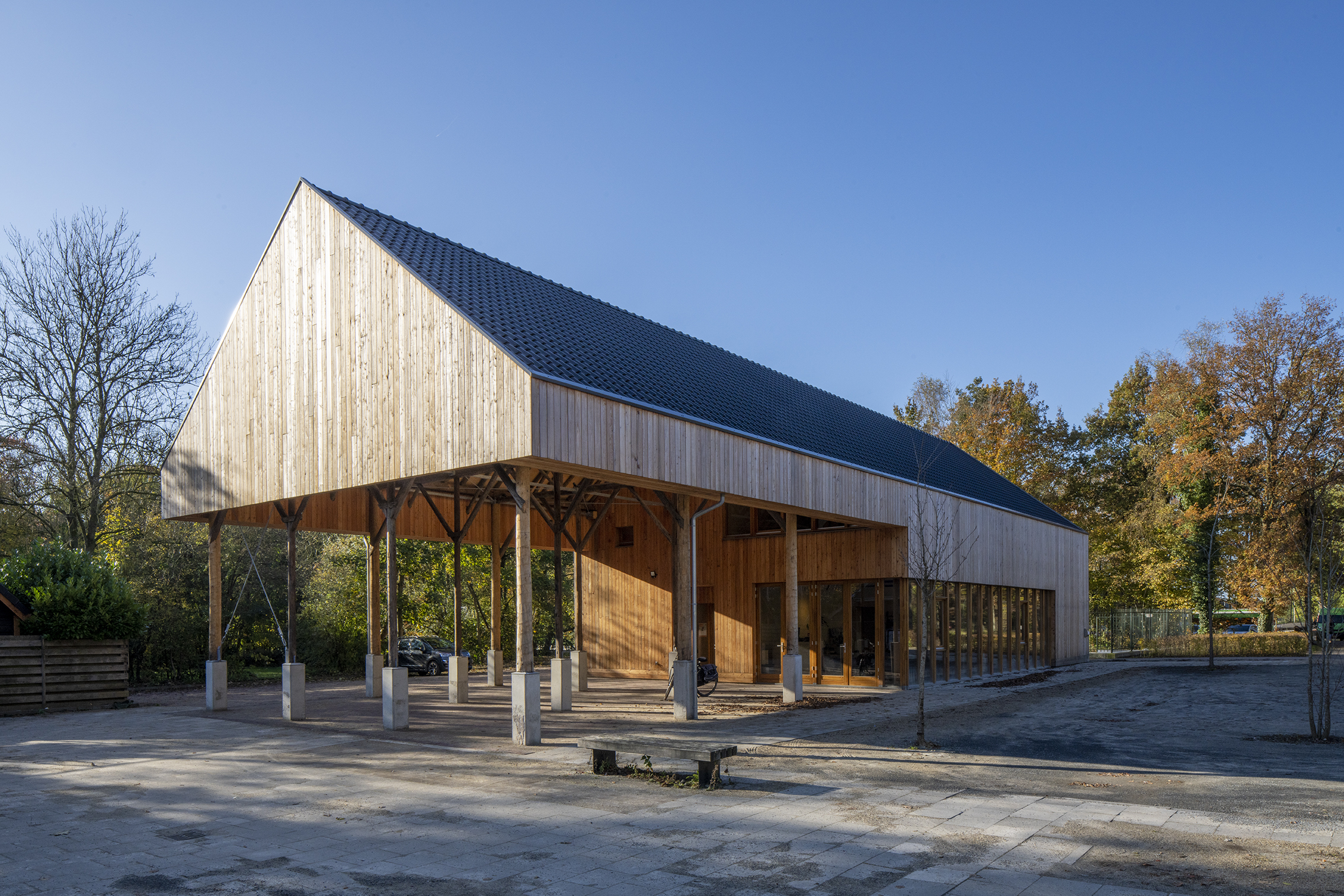 Het gebouw dat aan de zijkant van het terrein staat, is dienstbaar aan de plek: het biedt een welkom, een kop koffie, een plek voor samenkomst en een uitzicht over het kerkhof en verder, naar de weidsheid van het landschap.