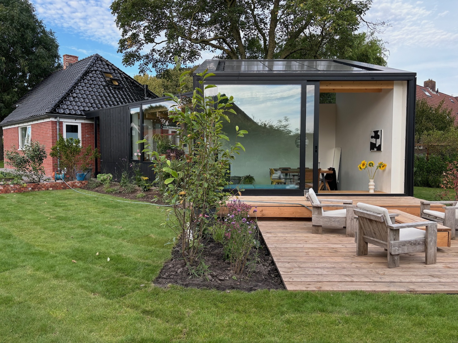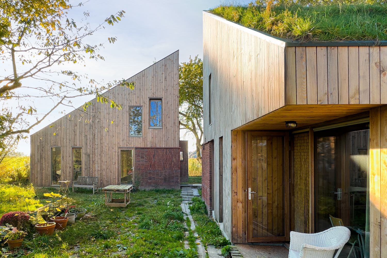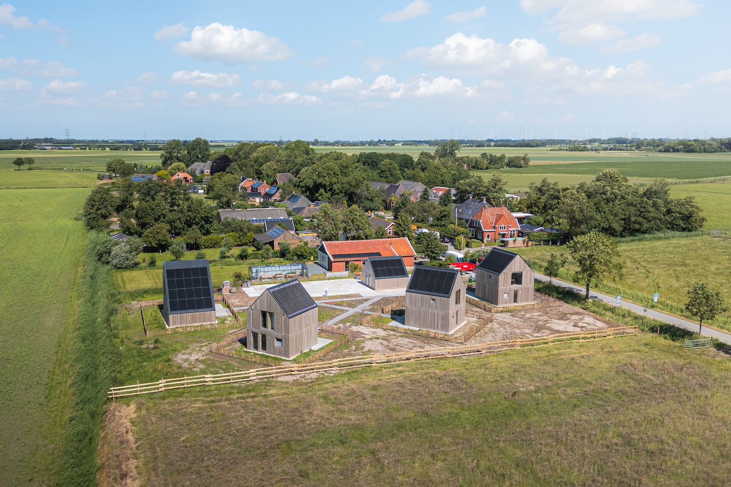 In plaats van één volume en een traditionele opzet van hoofdhuis en bijgebouwen is het wonen en werken ondergebracht in afzonderlijke volumes, maar wel met een sterke verwantschap in vorm en materiaal. Dat materiaal speelt een belangrijke rol, omdat bruikbare onderdelen van het oude huis zijn gebruikt in het nieuwe huis of op een andere plek. Daarmee is het project ook deels circulair. Het ontwerp is optimaal gericht op het omringende landschap, met prachtige zichtlijnen vanuit het huis op een boom, een kronkelend pad en eindeloze vergezichten. Het keert zich daarentegen van de weg af, wat weer minder goed past bij de manier waarop huizen in Groningen vaak gepositioneerd zijn.