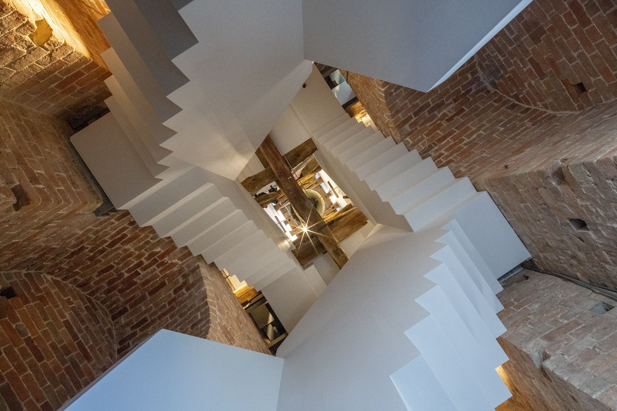 Het kerkgebouw is opengesteld voor verschillende vormen van gebruik. De grote verrassing zit 'm in de toren, waar een haast onmogelijke dubbele trap zich omhoog en weer naar beneden wentelt, dwars tussen eeuwenoude houten balken en de klok door. De route met de witte, abstracte trap laat de historische structuur van stenen en balken zien door bezoekers er letterlijk tegenaan en doorheen te laten lopen. Bovenin geeft de toren plotseling breed uitzicht over het Groninger land.